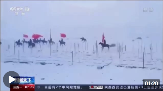 這段視頻拍攝于1月20日,中國國家越野滑雪隊結束在新疆溫泉縣集訓,踏上趕赴北京冬奧會的征途。目睹運動員們刻苦訓練的附近山區牧民,特意挑選20多匹駿馬自發組成馬隊,高舉國旗騎馬追趕車隊,并大聲吶喊助威。