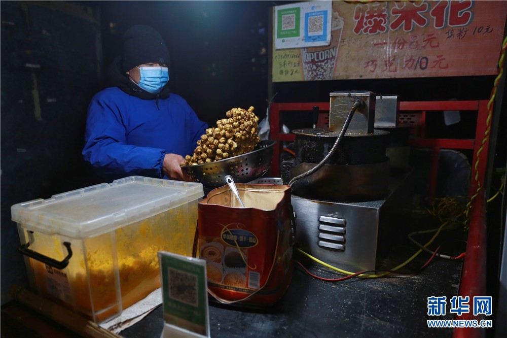 1月25日,在西安市未央區一家爆米花攤位,老板正在制作爆米花。新華網 王智超 攝