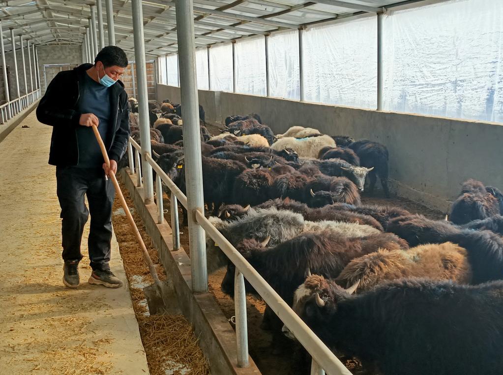 艾則孜·塔依爾在自家養殖大棚里照管幼年牦牛。(新華社記者潘瑩 攝)
