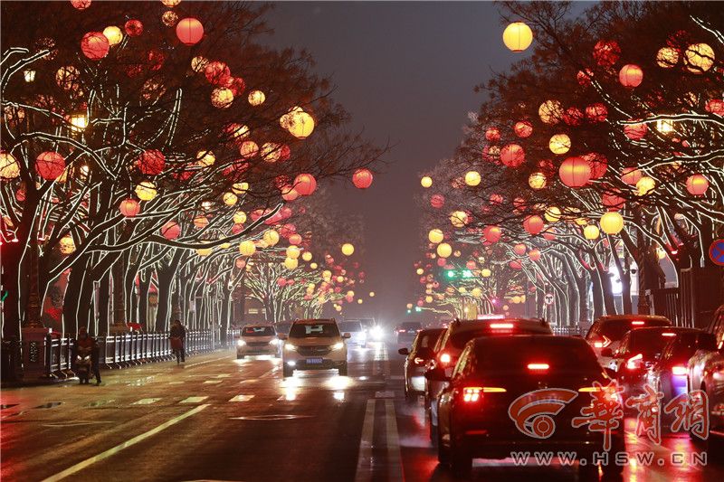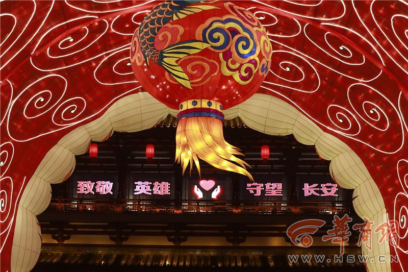 在雁南一路口設置了“致敬英雄 守望長安”燈組。宋立嬌介紹,設計這組燈是為了向抗疫英雄致敬,并鼓舞全市人民抗疫士氣。雁南一路以南水池上“百鳥朝鳳”燈組,以鳳凰、牡丹、百鳥為主題,打造百鳥朝鳳氛圍裝置,體現出一切生機勃勃,美好時光來臨,看到了一片美好的前景。