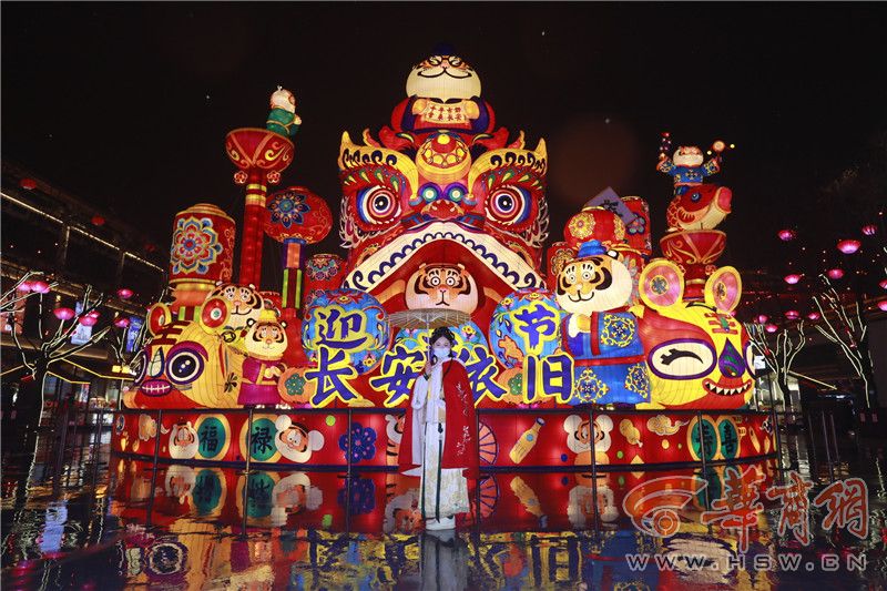 “虎虎生威”燈組坐落于街區地屏廣場處,底座直徑20米,高約15米,是大唐不夜城街區占地面積最大的一個燈組。燈組以生肖“虎”的Q版造型為主要形象,融入非遺布老虎和傳統虎頭帽等年節元素,展現了喜慶鬧春的生動景象。這組燈寓意喜慶納福、如意吉祥,將春節的福瑞和吉祥傳達給西安乃至全國人民。
