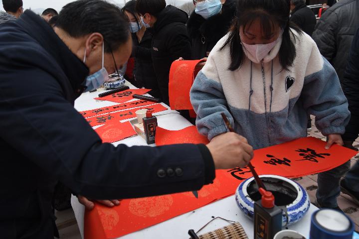 厙云兵的母親今天也很開心,看了秦腔表演,還在這場“集市”上得到了一對春聯:“虎躍龍騰抒壯志,山歡水笑展宏圖”。 (新華社記者崔翰超)