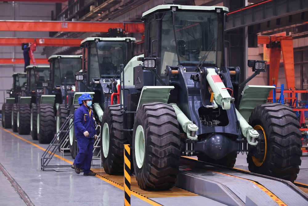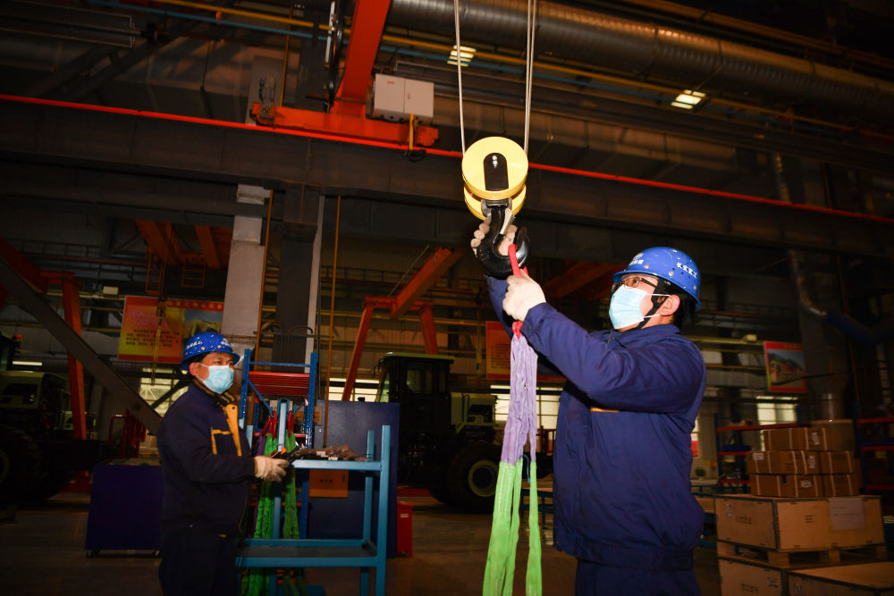 1月25日,在中鐵長安重工有限公司西安閻良生產基地,工人在總裝車間查看即將交付的機械設備。新華社記者 張博文 攝