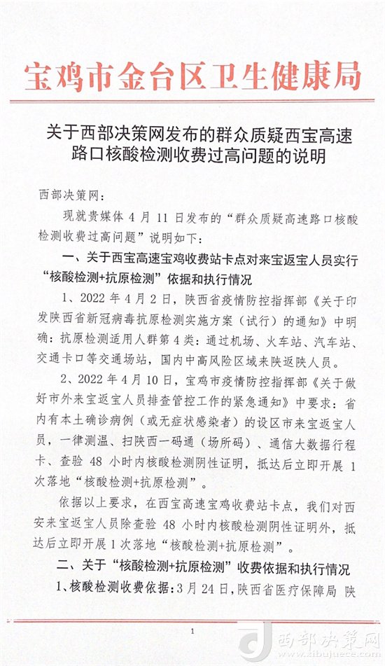 熱線回復|4月11日,寶雞市金臺區衛生健康局就“群眾質疑高速路口核酸檢測收費過高問題”向西部決策網回復并進行了情況說明。具體內容如下: