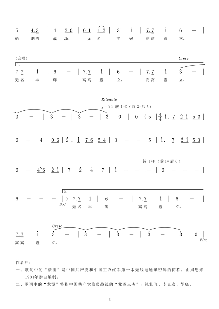 一、A1段歌詞中的“豪密”是中國共產黨和中國工農紅軍第一本無線電通訊密碼的簡稱,由周恩來1931年親自編制。