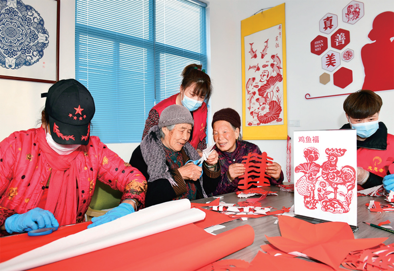 山東省日照市嵐山區按照就近、普惠原則建設養老服務中心,并組建志愿服務隊為老人提供助餐、助潔、助醫等愛心服務。圖為2022年2月27日,志愿者在日照市嵐山區虎山鎮黃家峪村養老服務中心陪老人剪紙、聊天?!⌒氯A社記者 郭緒雷/攝