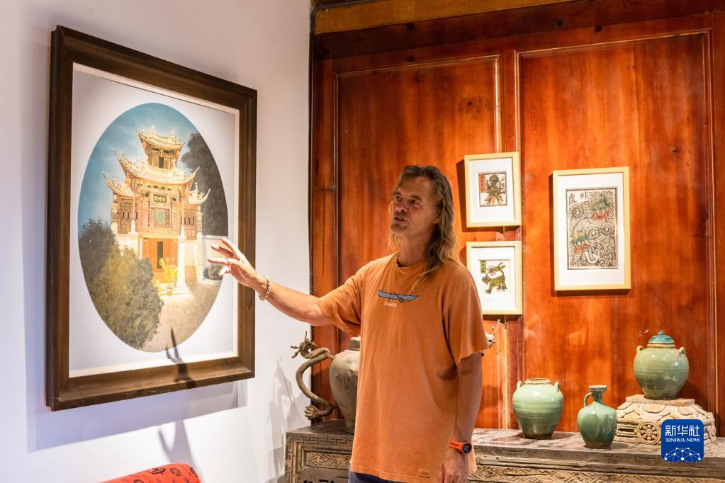 8月30日,林登在沙溪鎮石龍村村史館介紹當地藝術家的作品。新華社記者 曹夢瑤 攝