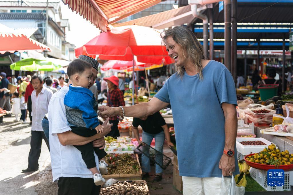 8月28日,林登在喜洲古鎮早市和小朋友打招呼。新華社記者 曹夢瑤 攝