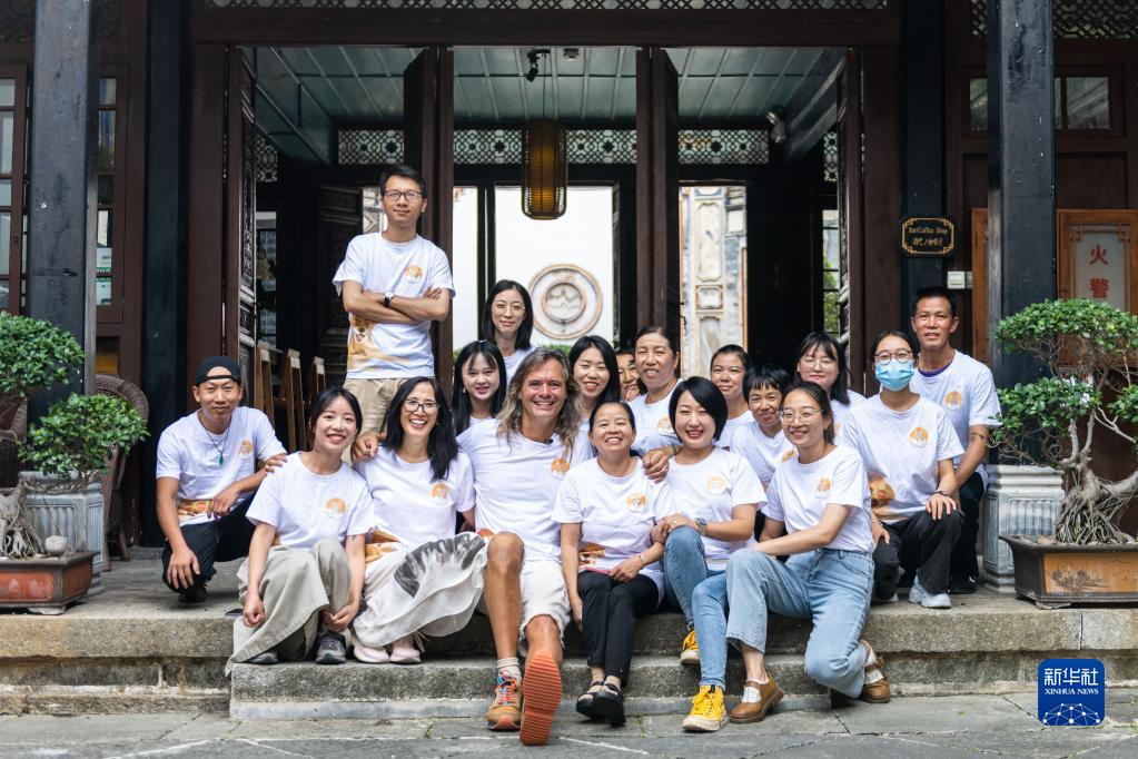 8月28日,林登和妻子瑾妮與喜林苑團隊在云南省喜洲古鎮喜林苑合影。新華社記者 曹夢瑤 攝