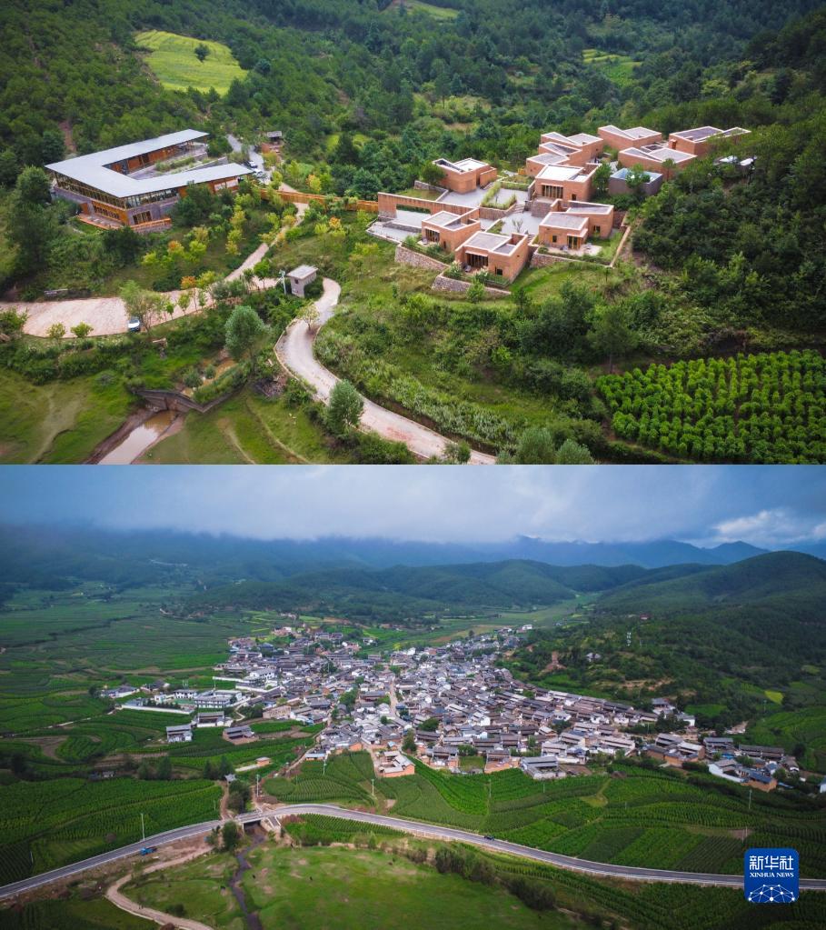 拼版照片:上圖為位于云南省沙溪鎮石龍村的喜林苑沙溪店(8月31日攝,無人機照片);下圖為喜林苑沙溪店所在的石龍村(8月31日攝,無人機照片)。新華社記者 曹夢瑤 攝