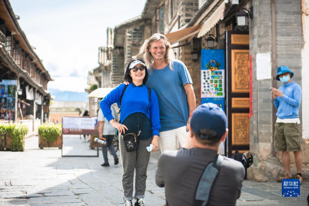 8月28日,林登在喜洲古鎮與游客合照。新華社記者 曹夢瑤 攝