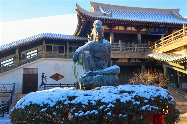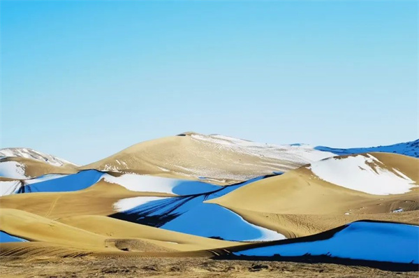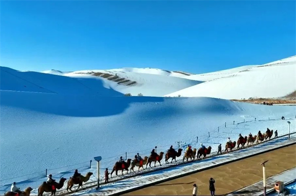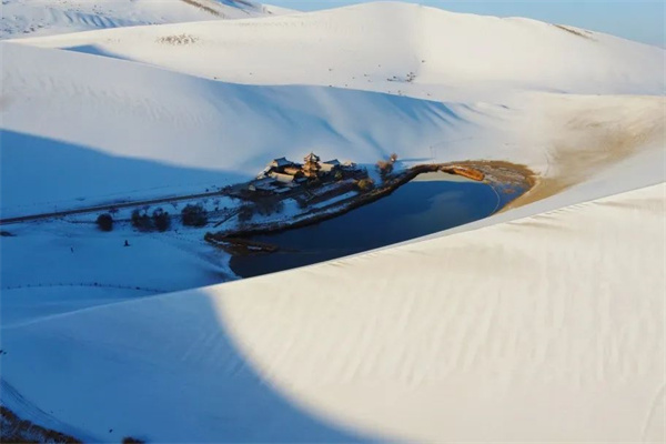 冬日的鳴沙山,皚皚白雪鋪天蓋地,將整個沙山脈裝點得如詩如畫,月牙泉被冰雪包圍,泉面的雪花堆積有如瓊漿玉液,無盡的潔白,湛藍、純白交相輝映,更顯神奇,吸引著眾多游客前來欣賞大漠雪色。