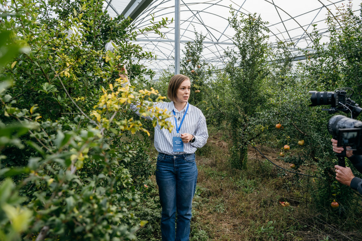 10月12日,歐亞主流媒體考察團成員在陜西省渭南市潼關縣軟籽石榴產業園內采訪調研。新華社發(朱軍強 攝)