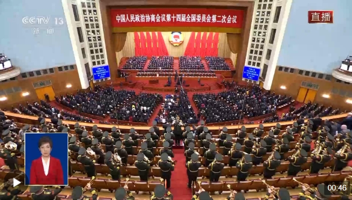3月4日下午3時,全國政協十四屆二次會議在人民大會堂開幕,全體起立,高唱中華人民共和國國歌。