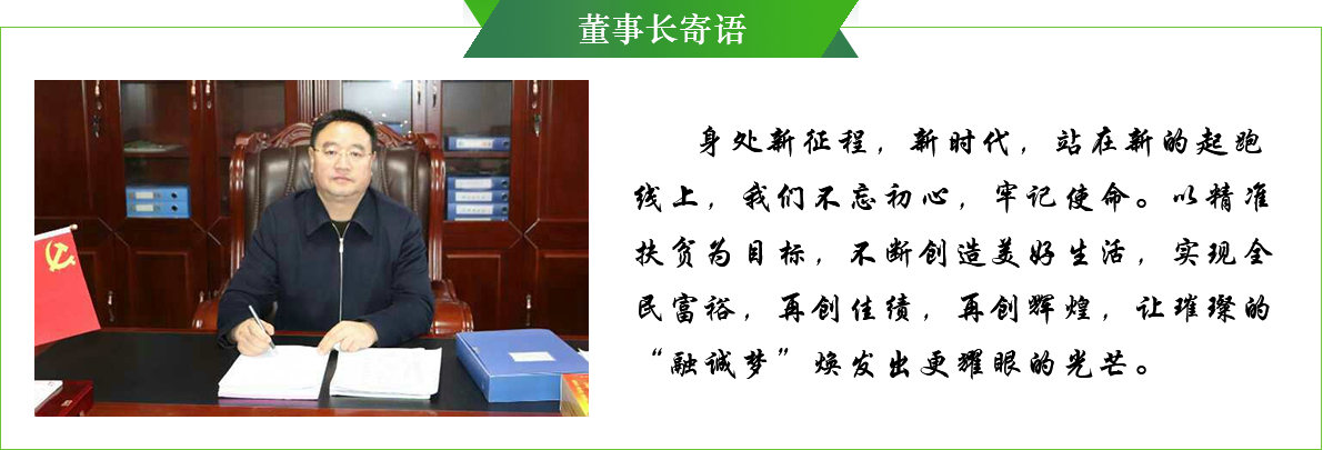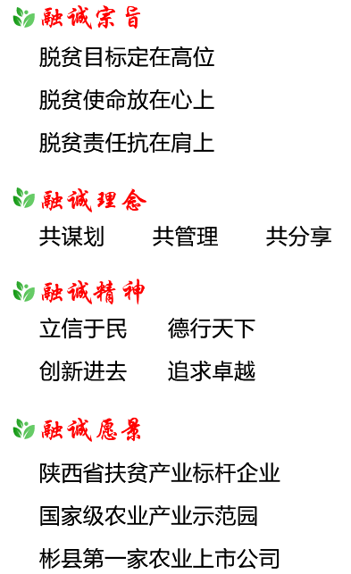 融誠興業北京投資管理集團公司是一家多元化實體發展公司,主要經營房地產 開發、文化旅游、公墓開發、金融投資、酒店餐飲、農業開發等多元化企業,注冊 資金13.8億元人民幣。2016年2月在外打拼艱苦創業贏得社會廣泛尊重的董事長馬 軍同志積極響應習總書記精準扶貧的偉大號召,本著“親農富農,回報家鄉,回報 社會”的念想,懷著為農民創造財富,為企業創造利潤,為社會創造價值的感恩情 懷和夢想,回到彬縣本土因地制宜,精心籌劃,投身“大眾創業萬眾創新”的行 列,在養育他成長的渭北高原上投資興業,創建了彬縣融誠農業科技集團有限公 司,公司位于彬縣北極鎮北玉村,占地300畝,計劃投資8.5億元,建設扶貧產業園 2個、重點企業6戶、種植基地2個,即北極融誠產業園、義門融誠產業園;富民果 袋廠、果箱廠、果肥廠、果貯廠、黃花菜加工廠、生態養殖場。總投資5000萬元, 年產60億只的富民果袋廠已正式投產。北極鎮旬麟路沿線建成有機蘋果示范基地 3110畝,安置當地貧困群眾368名,人均月收入3200元,帶動貧困戶132人。企業 已初步形成了以果袋、果箱、果肥、生產、銷售、果蔬儲藏、生態養殖、黃花菜種 植加工、農產品物流等為一體的農業全產業鏈。萬畝黃花菜基地和有機蘋果示范基 地初具規模,公司計劃利用四年時間,通過萬畝示范園輻射帶動彬縣、旬邑以及甘 肅正寧等地區。到2020年建成10萬畝以生產有機蘋果為主的現代果業生產園,產業 園建成后,年可實現產值12億元,利潤2億元,可安置就業職工1600余人,其中貧 困戶600余人。同時,大膽探索創建了融誠產業農村農民金融合作社和融誠農民產 業互助基金合作社,為助推精準扶貧、精準脫貧發揮了積極重要作用,鄉村特色產 業優勢彰顯,經濟發展前景廣闊。公司的發 展目標是打造陜西省產業扶貧標桿企業,國 家級農業產業示范園,彬縣第一家農業上市 公司。